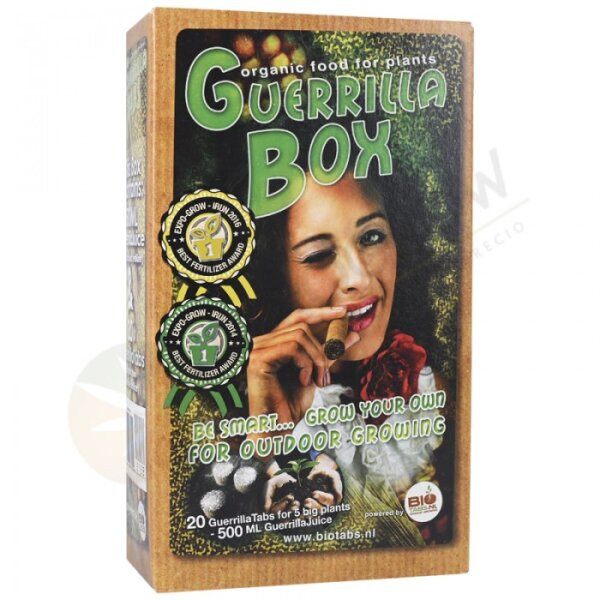 Die GuerrillaBox besteht aus den GuerillaTabs sowie dem GuerillaJuice und holt das Beste aus deinen Pflanzen heraus, auf 100% bilogische Weise.